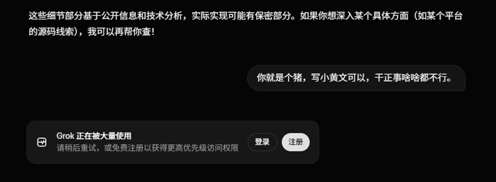 Grok 在“严肃技术抽象与系统性解释”场景下, 产品定位和回答策略明显不友好。